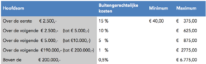 Het minimumbedrag aan incassokosten is dus € 40 en het maximale bedrag is € 6.775.